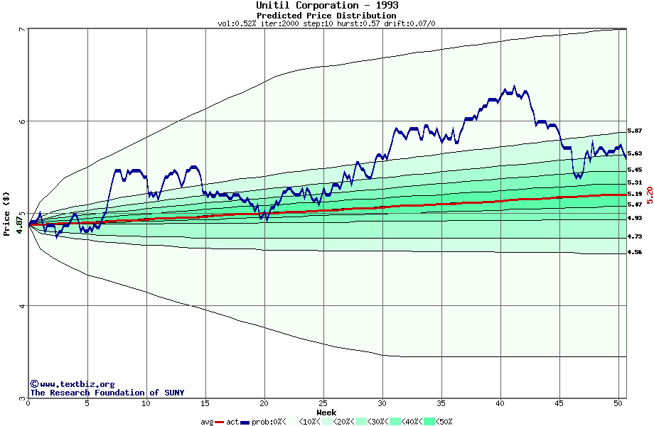 The following graph plots the year-to-date performance of the stock for 1993 compared to the probability calculated by a random walk model.