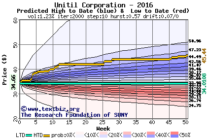 The high to date and low to date prices of the stock plotted against a random walk model for 2016 (what's this?).