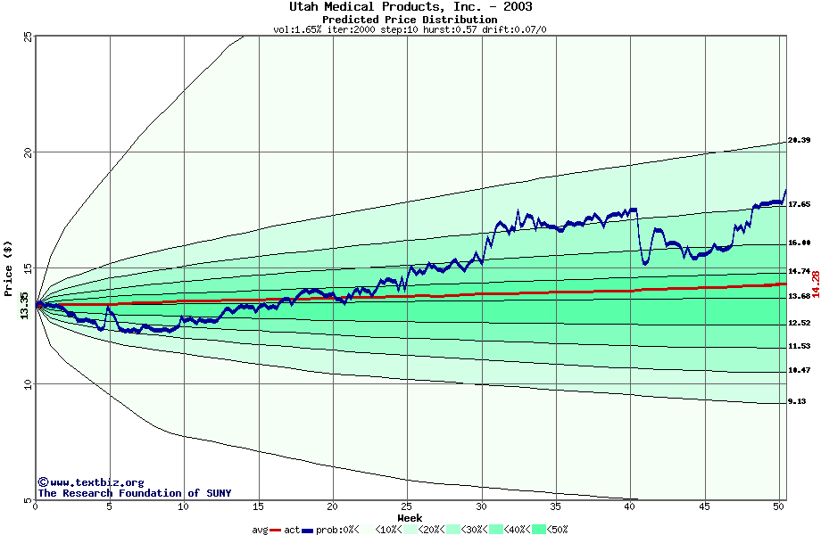 The following graph plots the year-to-date performance of the stock for 2003 compared to the probability calculated by a random walk model.