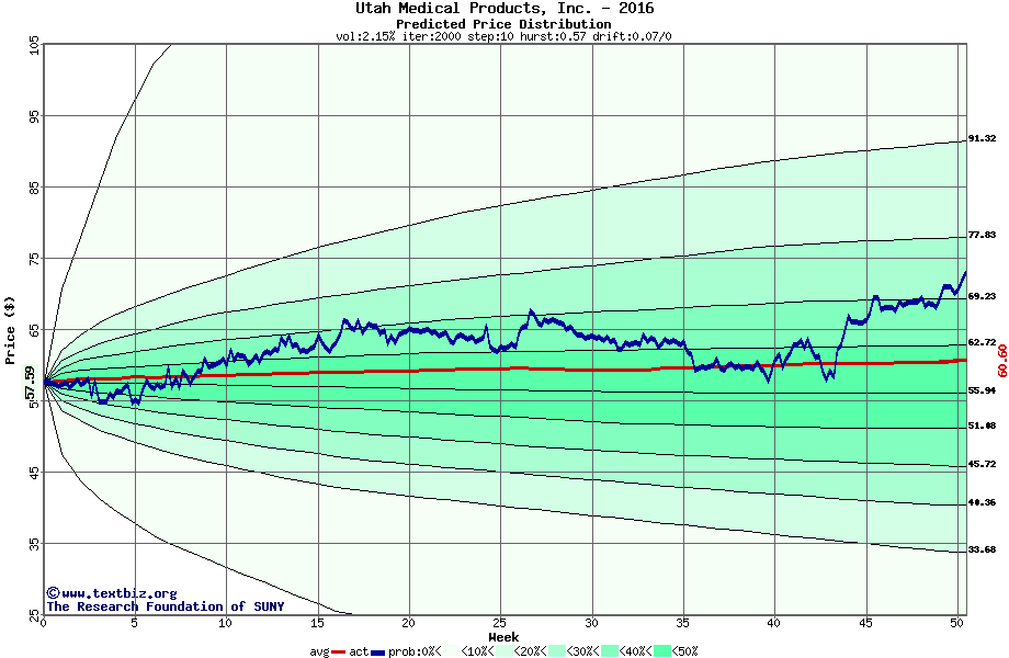 The following graph plots the year-to-date performance of the stock for 2016 compared to the probability calculated by a random walk model.
