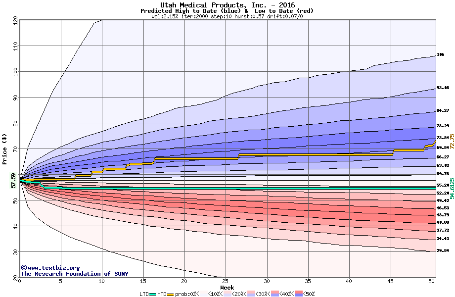 The high to date and low to date prices of the stock plotted against a random walk model for 2016 (what's this?).