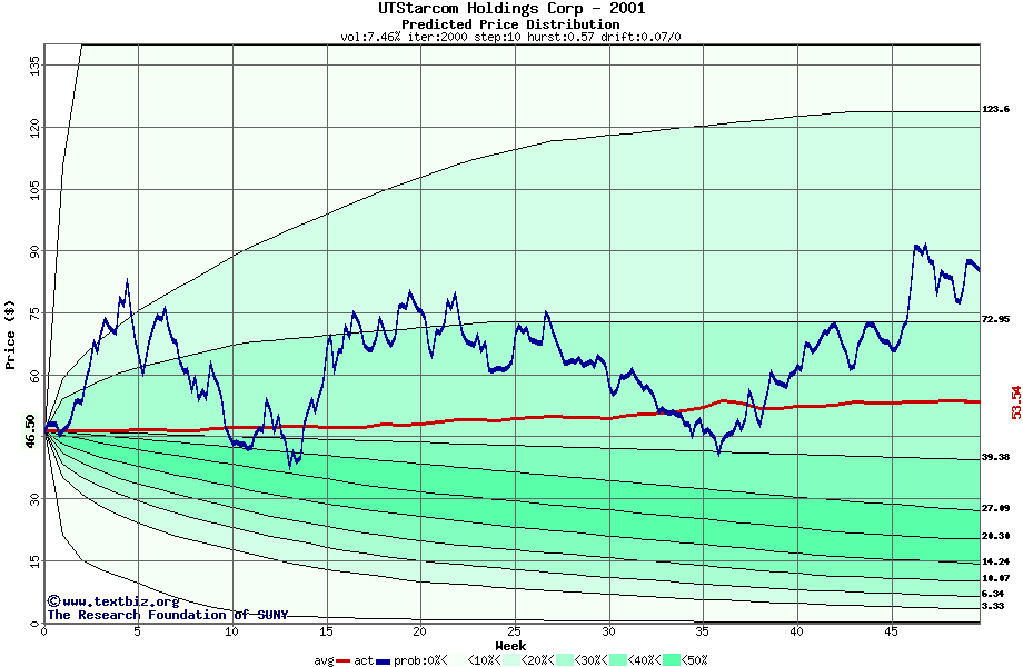 The following graph plots the year-to-date performance of the stock for 2001 compared to the probability calculated by a random walk model.