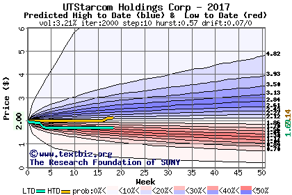 The high to date and low to date prices of the stock plotted against a random walk model for 2017 (what's this?).