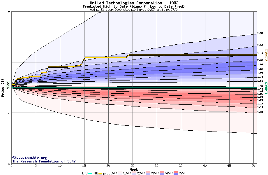 The high to date and low to date prices of the stock plotted against a random walk model for 1983 (what's this?).