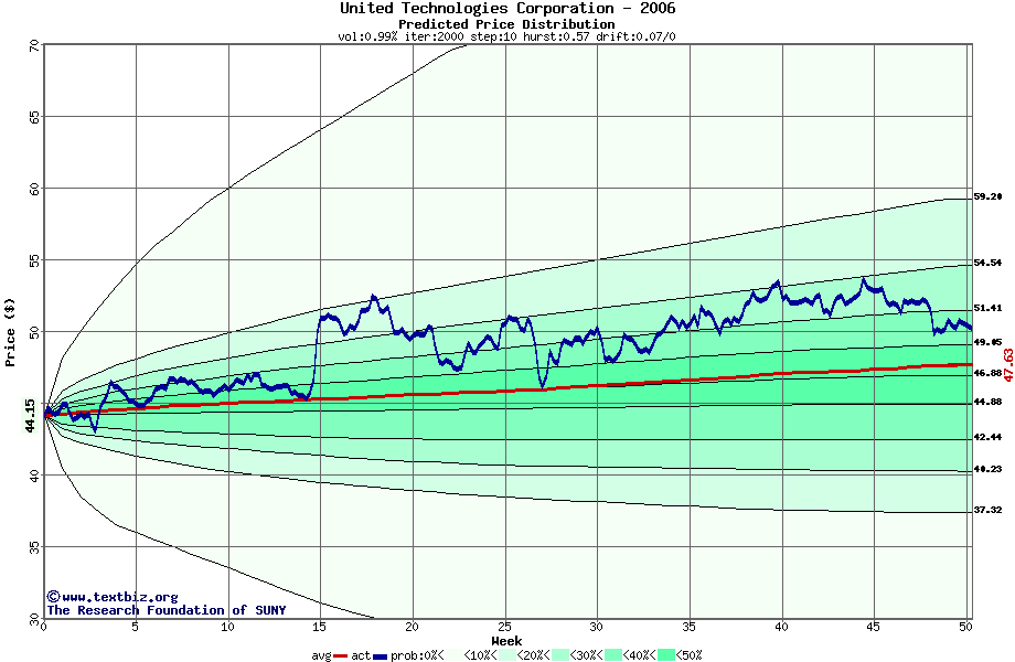 The following graph plots the year-to-date performance of the stock for 2006 compared to the probability calculated by a random walk model.