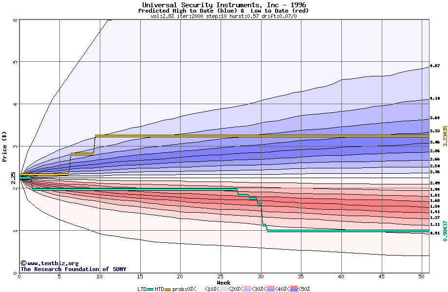 The high to date and low to date prices of the stock plotted against a random walk model for 1996 (what's this?).