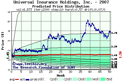 The high to date and low to date prices of the stock plotted against a random walk model for 2007 (what's this?).