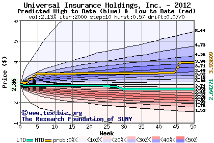 The high to date and low to date prices of the stock plotted against a random walk model for 2012 (what's this?).