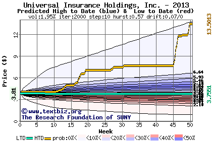 The high to date and low to date prices of the stock plotted against a random walk model for 2013 (what's this?).