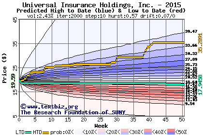 The high to date and low to date prices of the stock plotted against a random walk model for 2015 (what's this?).