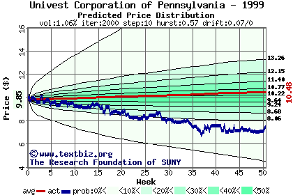 The high to date and low to date prices of the stock plotted against a random walk model for 1999 (what's this?).