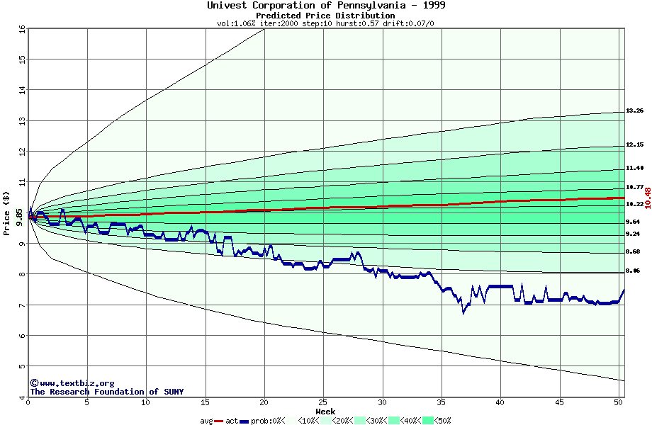 The following graph plots the year-to-date performance of the stock for 1999 compared to the probability calculated by a random walk model.