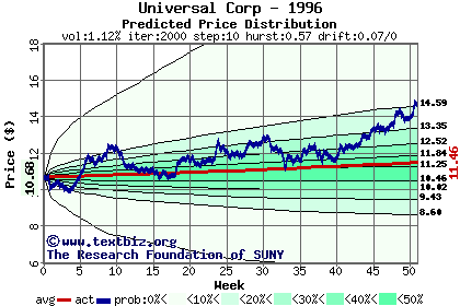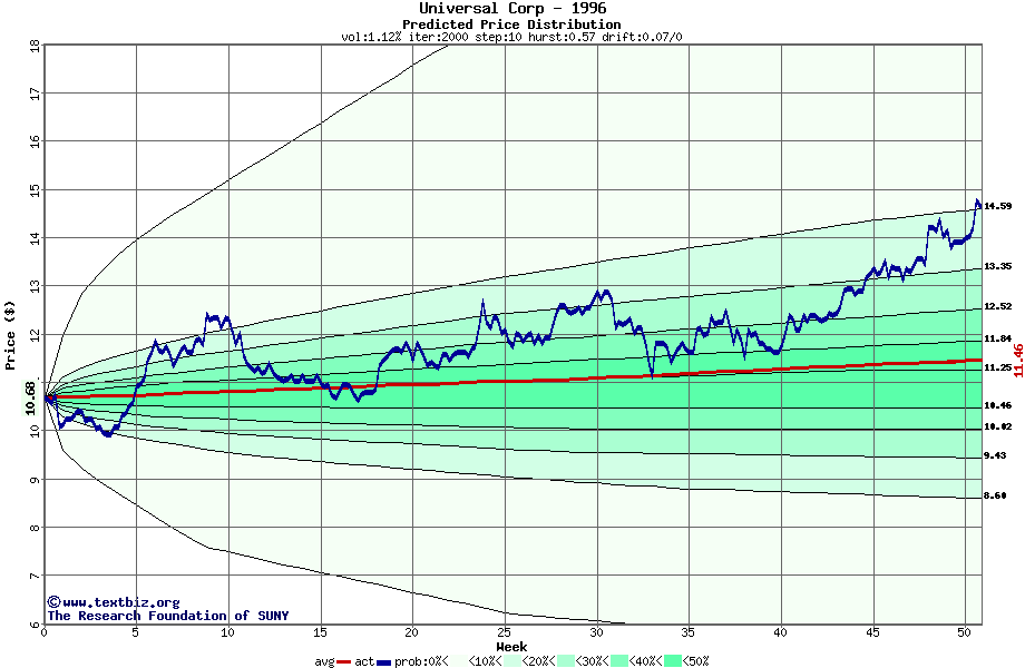 The following graph plots the year-to-date performance of the stock for 1996 compared to the probability calculated by a random walk model.