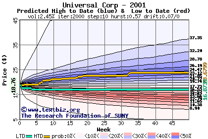 The high to date and low to date prices of the stock plotted against a random walk model for 2001 (what's this?).