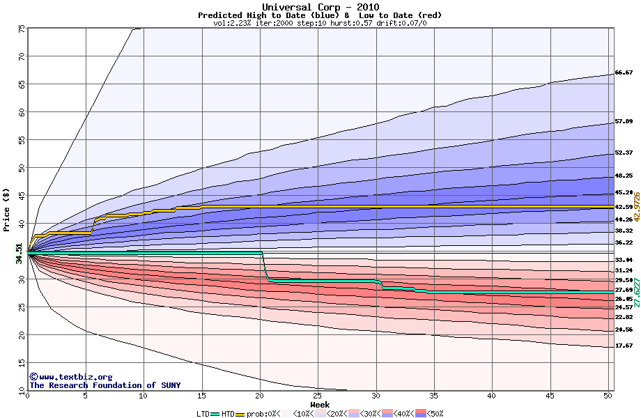 The high to date and low to date prices of the stock plotted against a random walk model for 2010 (what's this?).