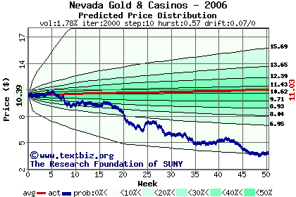 The high to date and low to date prices of the stock plotted against a random walk model for 2006 (what's this?).