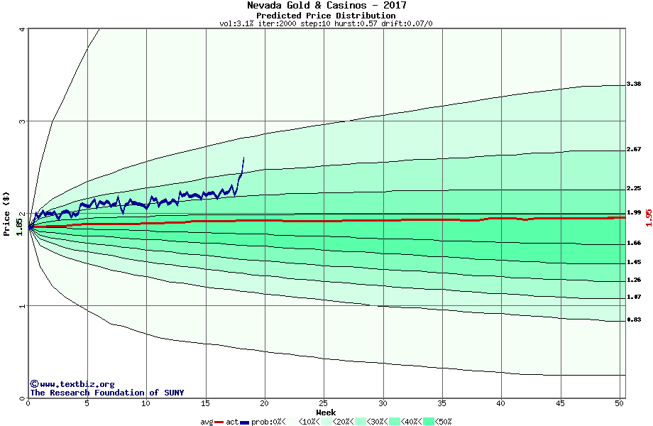 The high to date and low to date prices of the stock plotted against a random walk model for 2017 (what's this?).