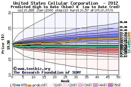 The high to date and low to date prices of the stock plotted against a random walk model for 2012 (what's this?).