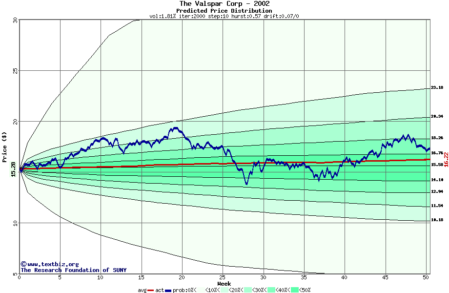 The following graph plots the year-to-date performance of the stock for 2002 compared to the probability calculated by a random walk model.