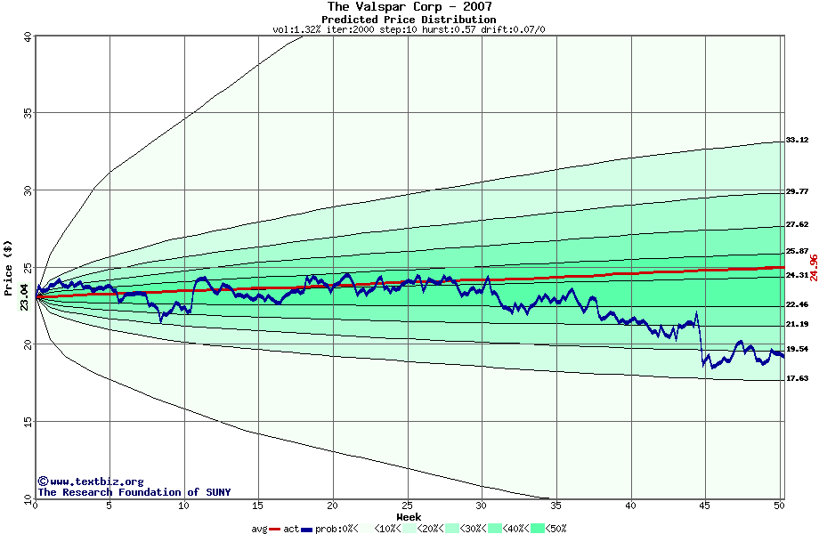 The following graph plots the year-to-date performance of the stock for 2007 compared to the probability calculated by a random walk model.