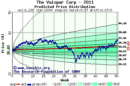 The high to date and low to date prices of the stock plotted against a random walk model for 2011 (what's this?).
