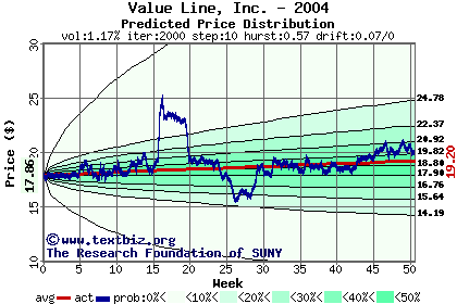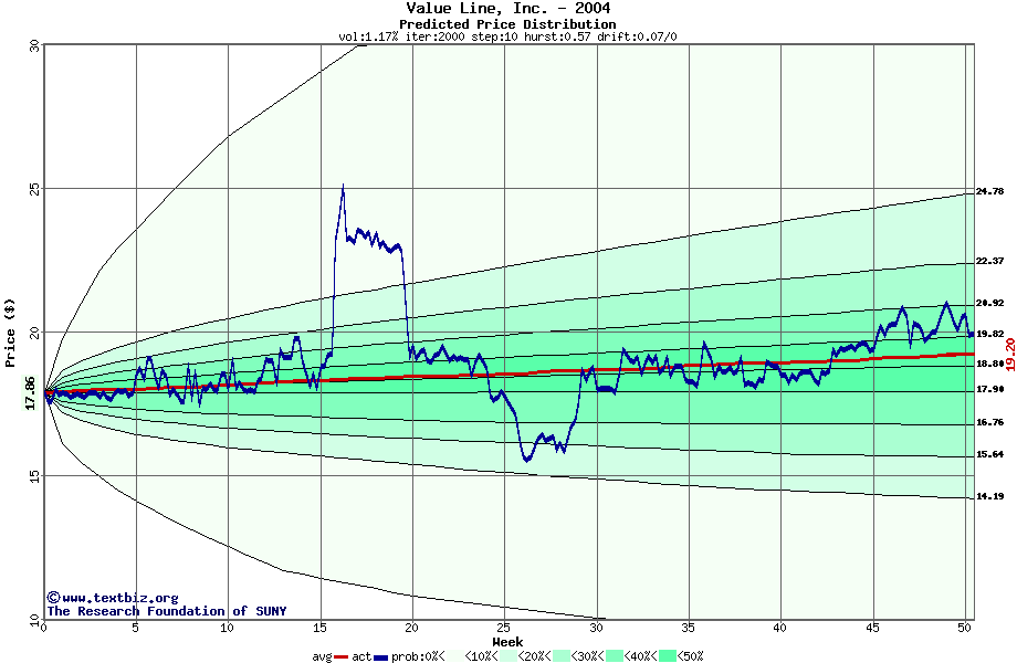 The following graph plots the year-to-date performance of the stock for 2004 compared to the probability calculated by a random walk model.