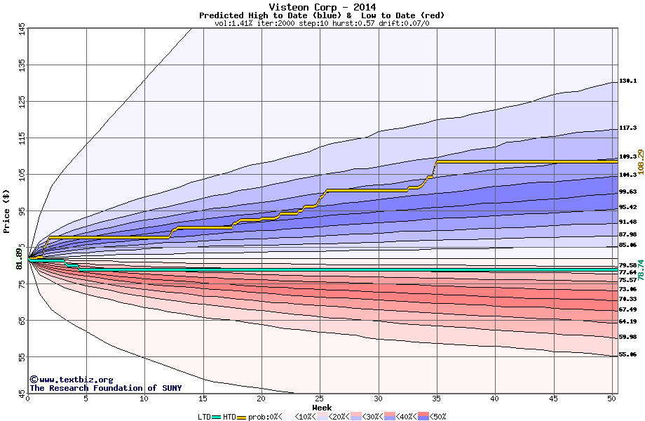 The following graph plots the year-to-date performance of the stock for 2014 compared to the probability calculated by a random walk model.