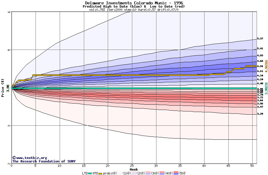 The high to date and low to date prices of the stock plotted against a random walk model for 1996 (what's this?).