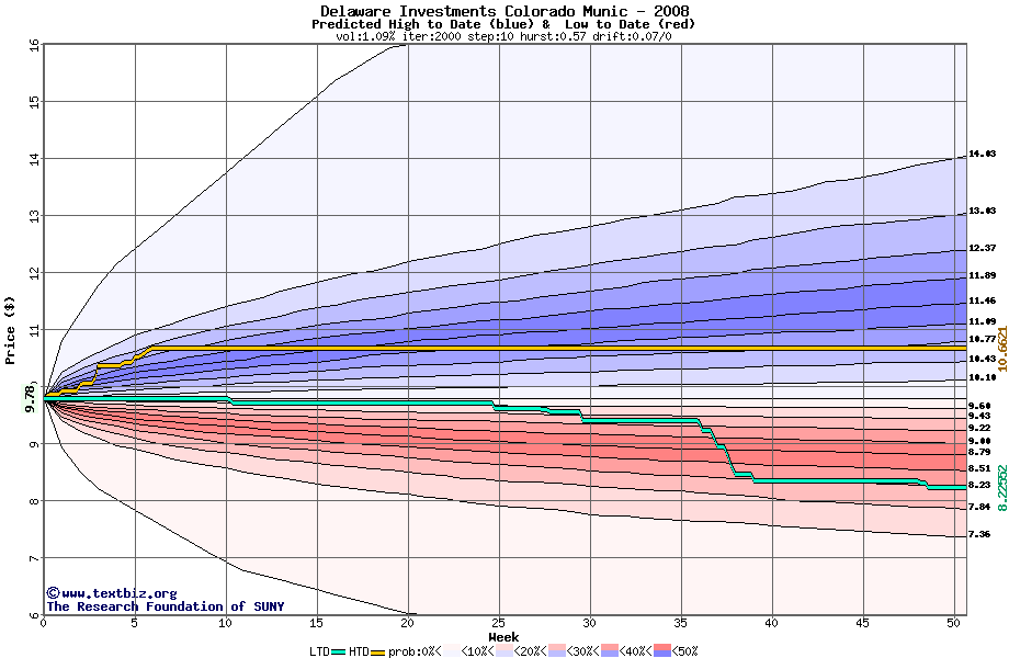 The high to date and low to date prices of the stock plotted against a random walk model for 2008 (what's this?).