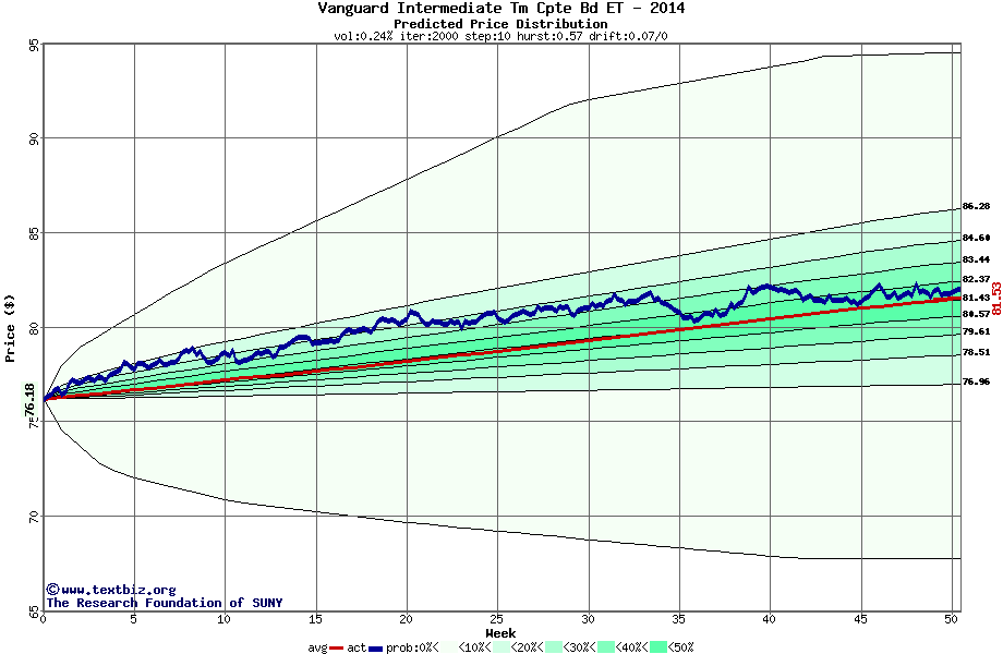 The following graph plots the year-to-date performance of the stock for 2014 compared to the probability calculated by a random walk model.