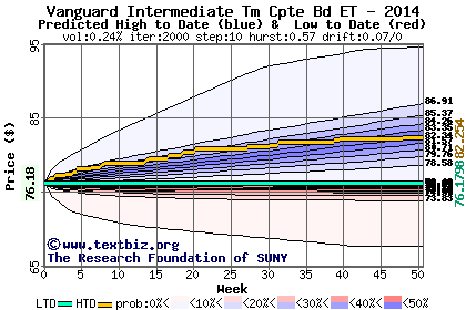 The high to date and low to date prices of the stock plotted against a random walk model for 2014 (what's this?).