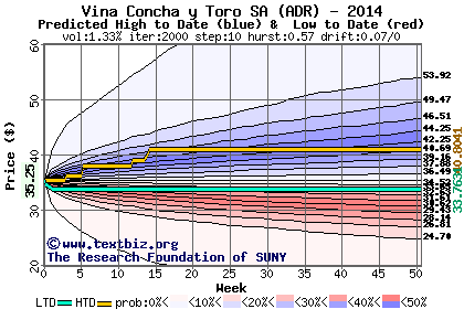 The high to date and low to date prices of the stock plotted against a random walk model for 2014 (what's this?).