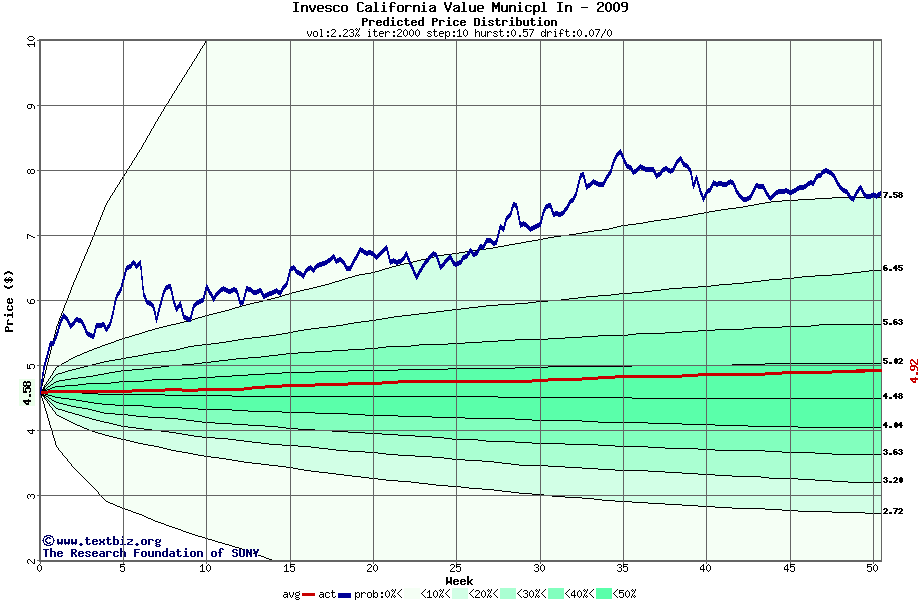 The following graph plots the year-to-date performance of the stock for 2009 compared to the probability calculated by a random walk model.