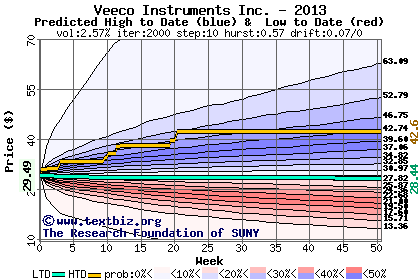 The high to date and low to date prices of the stock plotted against a random walk model for 2013 (what's this?).