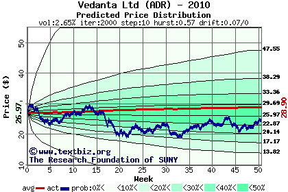 The high to date and low to date prices of the stock plotted against a random walk model for 2010 (what's this?).