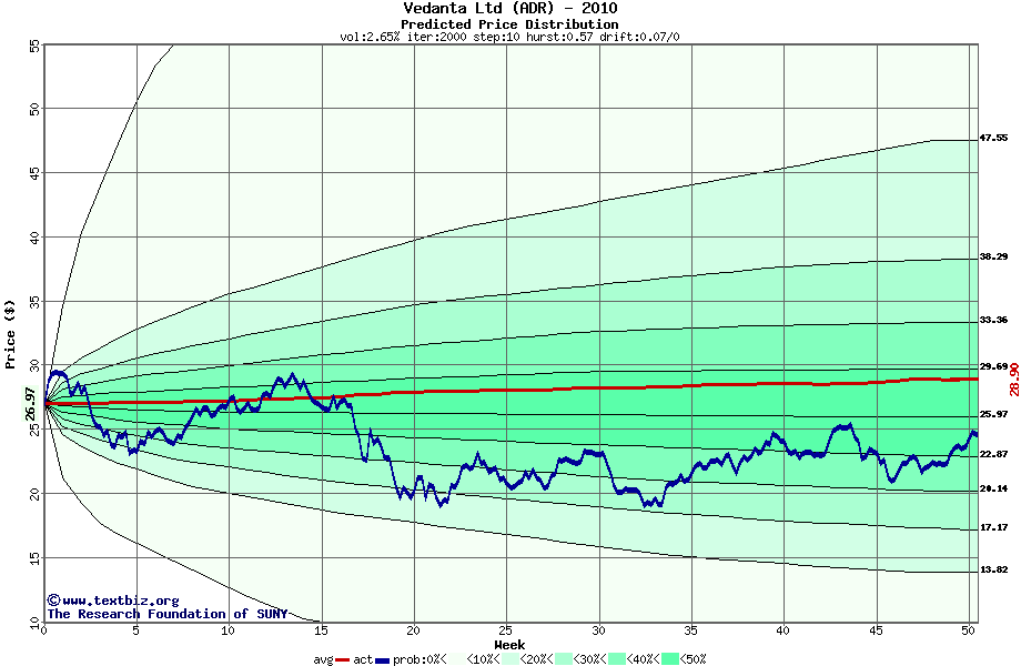 The following graph plots the year-to-date performance of the stock for 2010 compared to the probability calculated by a random walk model.