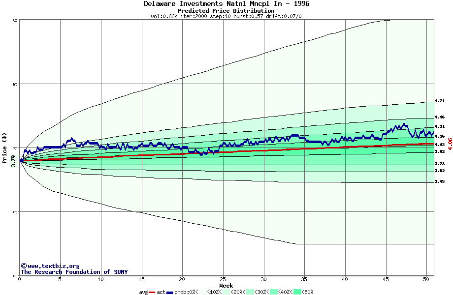 The following graph plots the year-to-date performance of the stock for 1996 compared to the probability calculated by a random walk model.