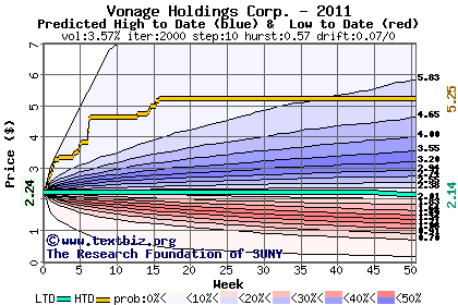 The high to date and low to date prices of the stock plotted against a random walk model for 2011 (what's this?).
