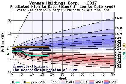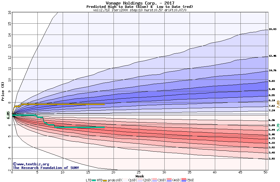 The high to date and low to date prices of the stock plotted against a random walk model for 2017 (what's this?).