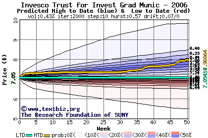 The high to date and low to date prices of the stock plotted against a random walk model for 2006 (what's this?).