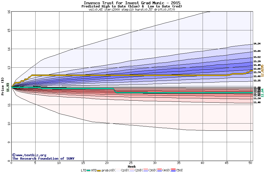 The high to date and low to date prices of the stock plotted against a random walk model for 2015 (what's this?).