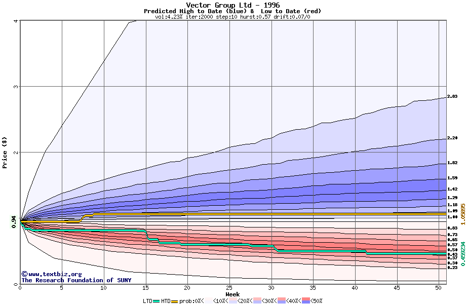 The high to date and low to date prices of the stock plotted against a random walk model for 1996 (what's this?).