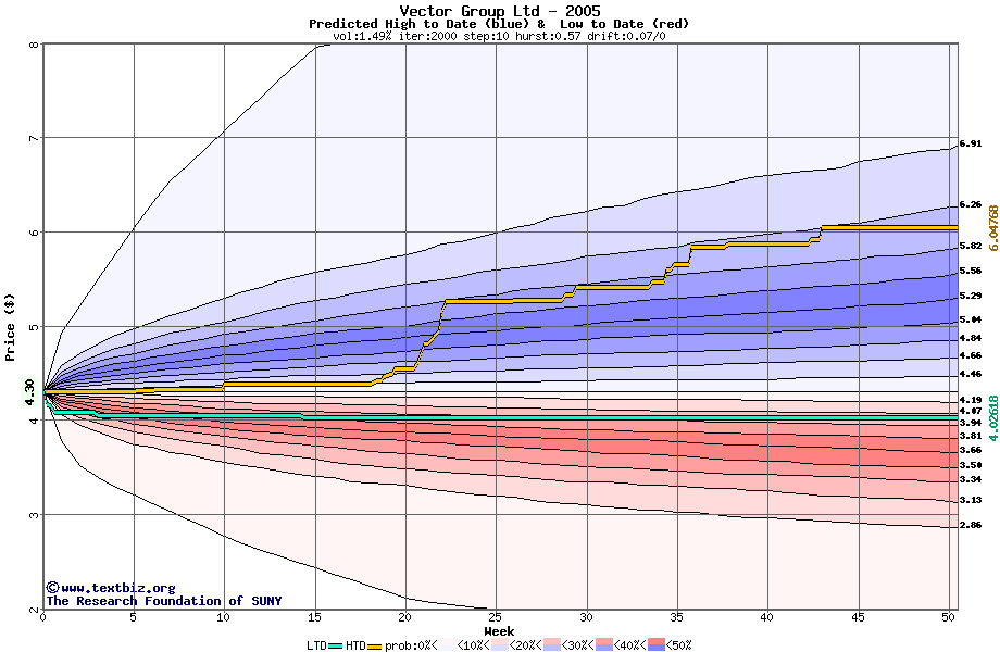The high to date and low to date prices of the stock plotted against a random walk model for 2005 (what's this?).
