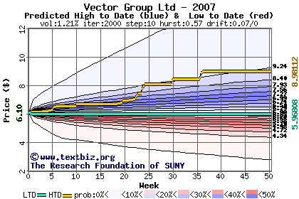 The high to date and low to date prices of the stock plotted against a random walk model for 2007 (what's this?).