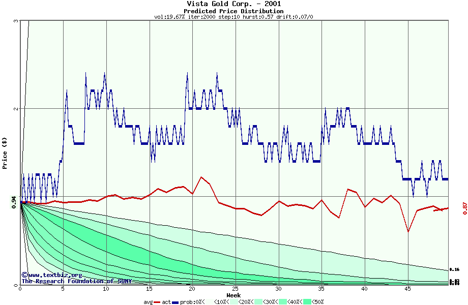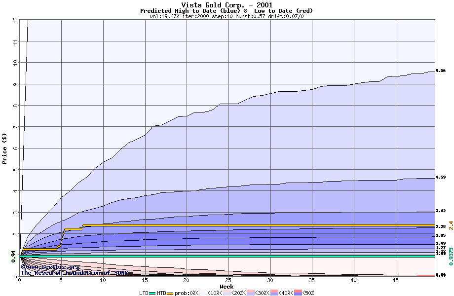 The high to date and low to date prices of the stock plotted against a random walk model for 2001 (what's this?).