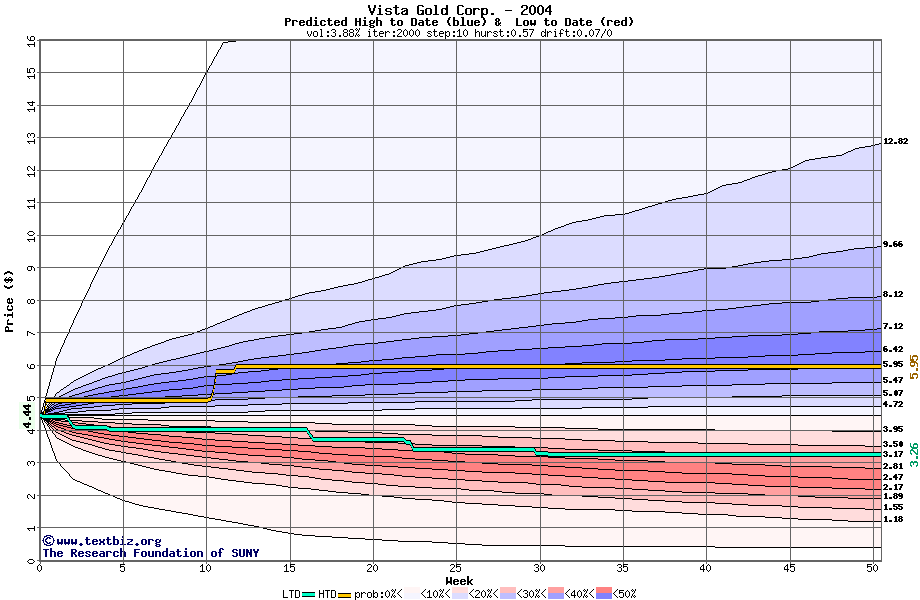 The high to date and low to date prices of the stock plotted against a random walk model for 2004 (what's this?).