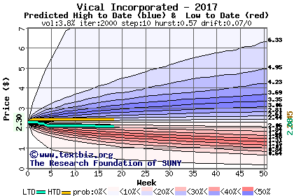 The high to date and low to date prices of the stock plotted against a random walk model for 2017 (what's this?).