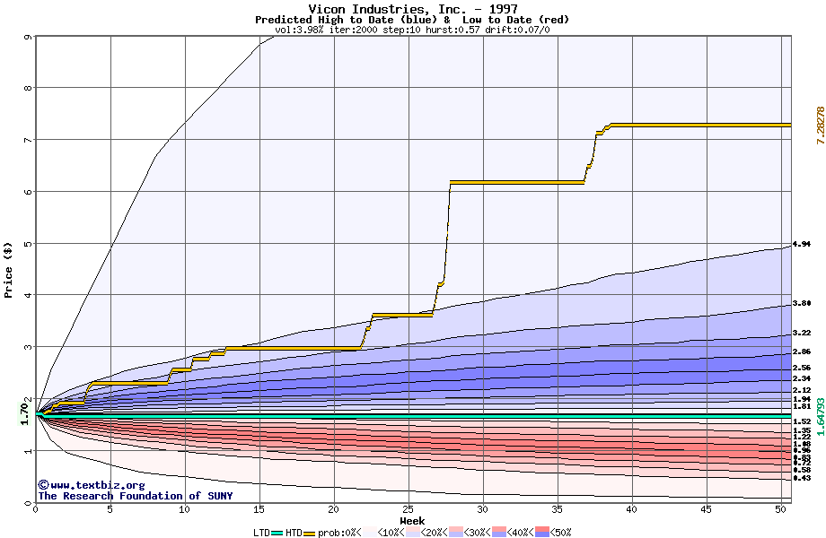 The high to date and low to date prices of the stock plotted against a random walk model for 1997 (what's this?).