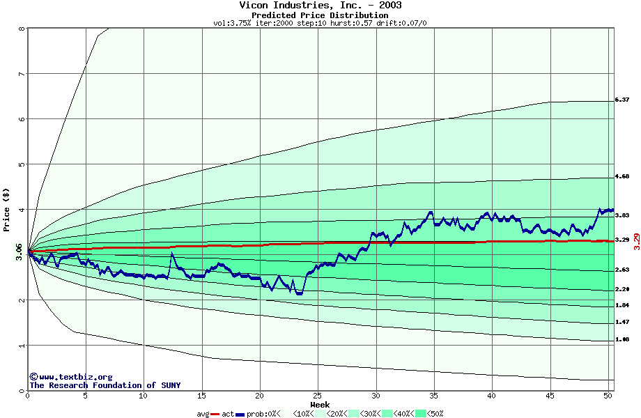The following graph plots the year-to-date performance of the stock for 2003 compared to the probability calculated by a random walk model.