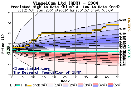 The high to date and low to date prices of the stock plotted against a random walk model for 2004 (what's this?).